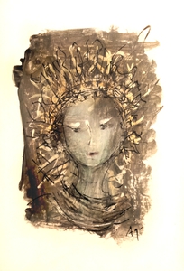 2021Inkt/collage,model is een meisje uit de Vermeerstraat, in de voetspoor van Vermeer, glas/ lood sfeer